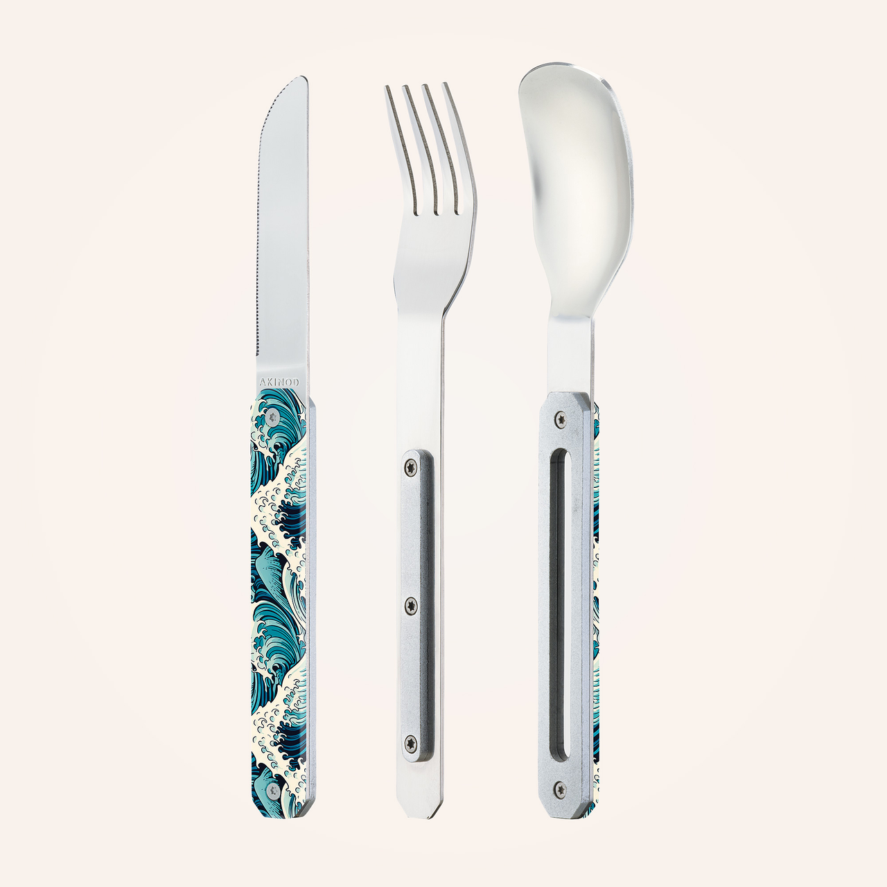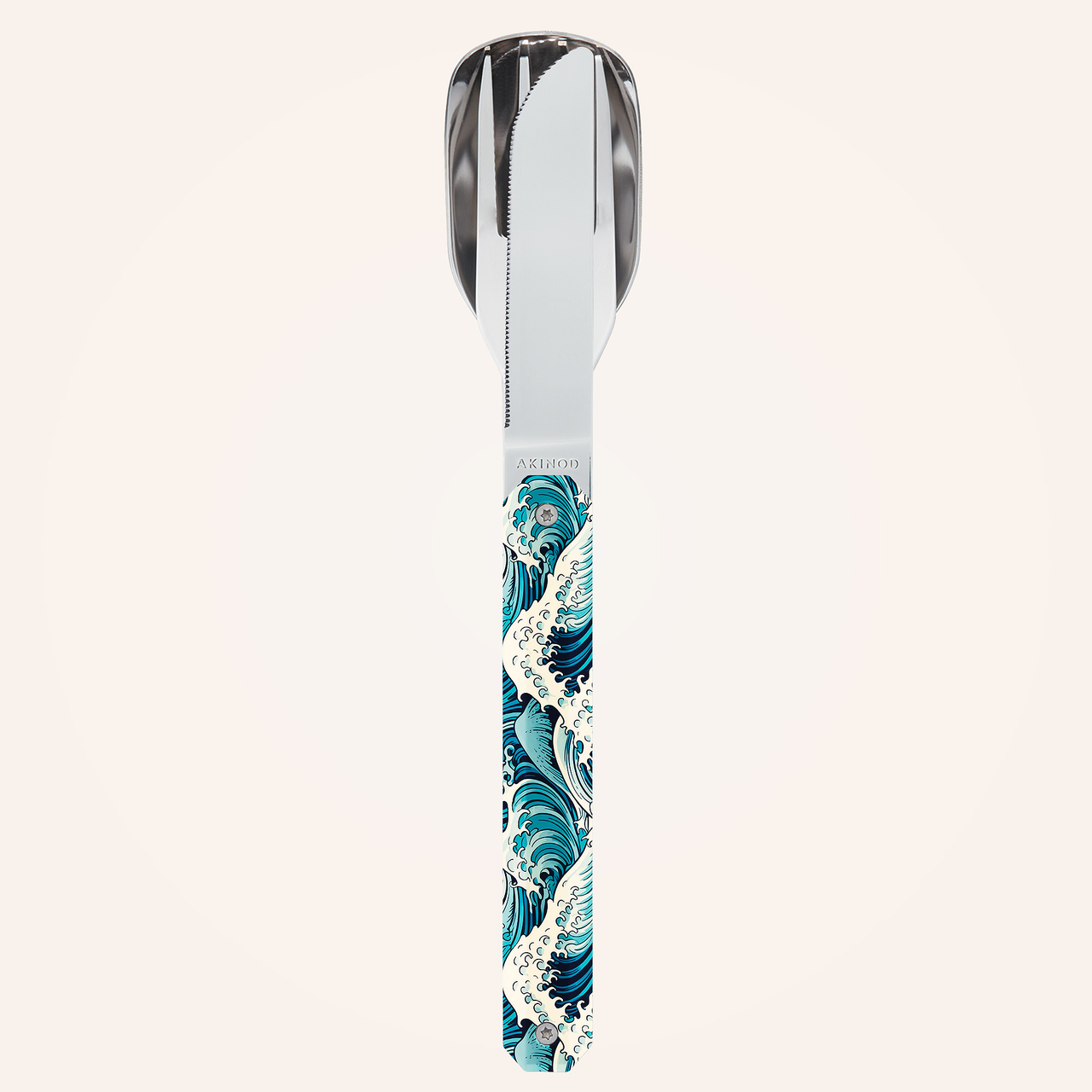 Couverts en acier inoxydable martensitique 2CR14, finition poli miroir. Composé d’une grande cuillère, d’une fourchette 4 dents et d’un couteau à lame micro dentée. Manche en polymère (PC) transparent décoré. Assemblage aimanté. Livré avec étui de transport en polypropylène rigide (PP). Compatible lave-vaisselle.